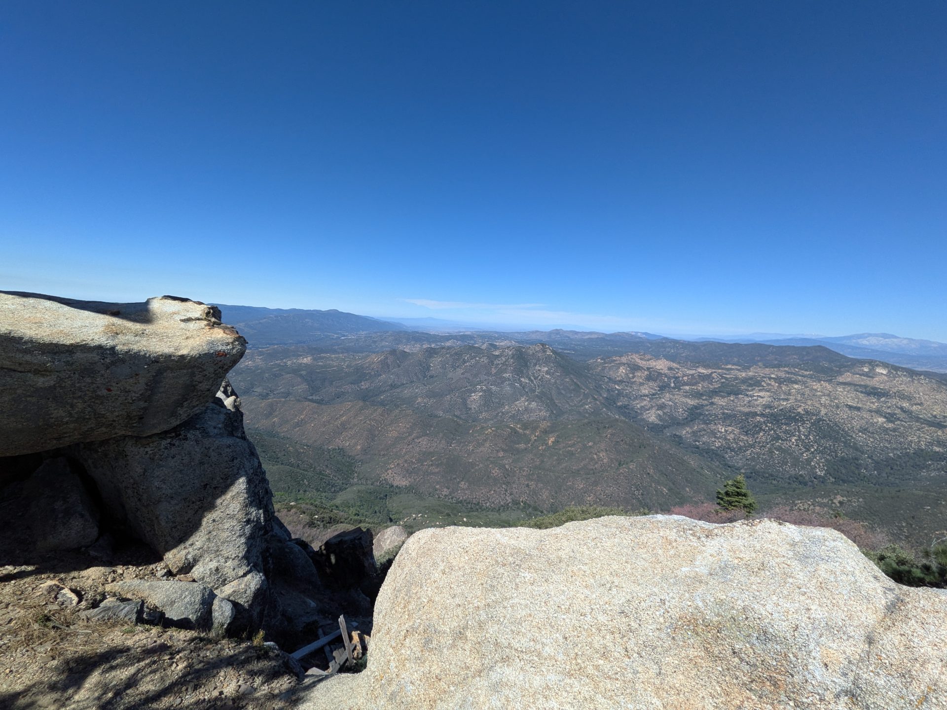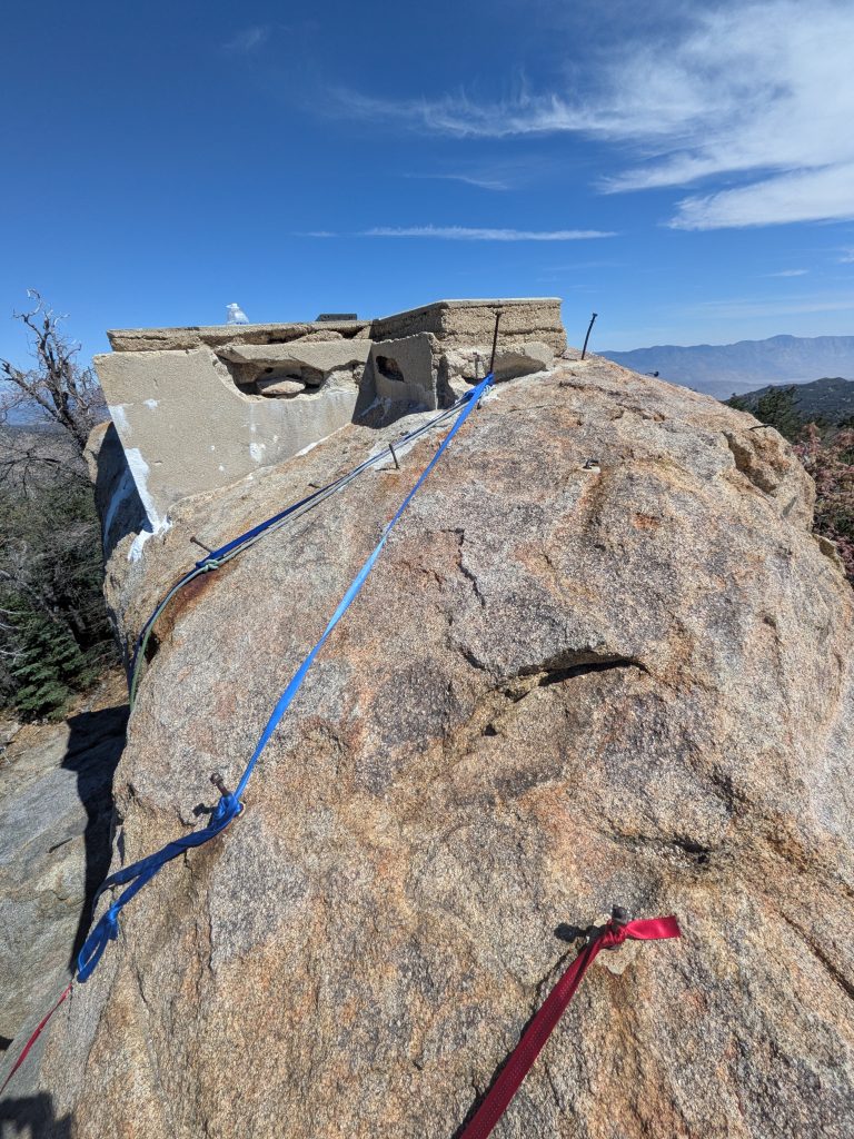 The trail remains a fire road all the way to the top. Great views from both the fire lookout Tower and of course the summit itself. To get to the summit you have to take a very narrow winding single track trail that is marked by blue and white ribbons. There are ropes and a ladder in place to climb up on top of the boulder that marks the actual summit. A spectacular view, well worth the hike.  A lot of what smelled like lilac bushes were blooming and lots of poppies.