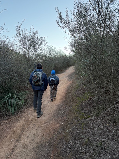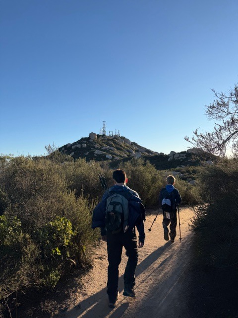 Planned on doing Corte Madera but saw 50 mph winds and a wind chill down to 13 degrees so decided to stay north and hit Mt. Woodson. Got there around 5:50 and the fisherman were already lined up waiting for the gate to open. Got in a little after 6 and it was cold and windy. Bundled up with the two boys and we made it to the summit. It was even colder and windier up there. Ate some homemade burritos and headed down. Fun hike with some elements we aren’t used to. Makes a great story. If you are searching for the survey marker, it’s on the boulder with the cement structure on top. You have to climb a piece of wood to get up the boulder.