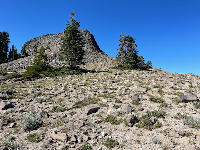 The forecast called for warm days (in the 80s), so we got a pre-dawn start with hopes of being off the trail during the hottest part of the day. The trail took us initially through a forest before it opened up to the ridge with the remainder of the hike on the ridge and through a couple of large rock fields (path was smooth in between the rocks).